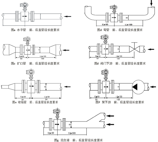 傳感器上游要有一定的直管段,但其長度與其它流量儀表(如超聲波流量計)相比較要求較低。上游如有90°彎頭、T形管、同心異徑管、全開閘閥等擾流件,一般要求離電極中心線(不是傳感器進口斷面)有5倍直徑(5D)長度的直管段,如是上游有閘閥且沒有全部打開,一般要求10D長度的直管段;下游直管段長度一般為2D-3D,或更短;