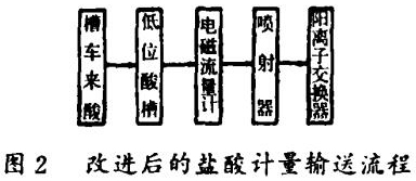 新工藝省去了高位酸槽、酸計量箱和酸霧吸收器,鹽酸計量由管道式流量計控制。該系統是在負壓狀態下運行,消除了溢酸和鹽酸的揮發,解決了對一些設備和設施的腐蝕,以及酸霧對環境的污染問題,使用比較安全可靠。