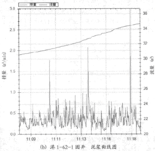 在固井全程的曲線中,也可以發(fā)現(xiàn)開始固井的時(shí)候.泥漿排量雜波較小,究其原因是剛開始固并時(shí),泥漿管線剛泄壓,管線中還是充滿了液體,雖然振動(dòng)強(qiáng)度雷同.但是葉片有阻尼,振幅較小.對其影響也較小。例如曲線圖的11;03: 00-11: 03: 53之間的泥漿排量沒有雜波。在港1-62-1固井過程中,水泥漿打了413澎,結(jié)果本應(yīng)該是0的泥漿,卻走數(shù)了23.0 m',其影響可謂巨大.并非通過普通的濾波或切除所能排除,必須執(zhí)行一個(gè)特殊算法。