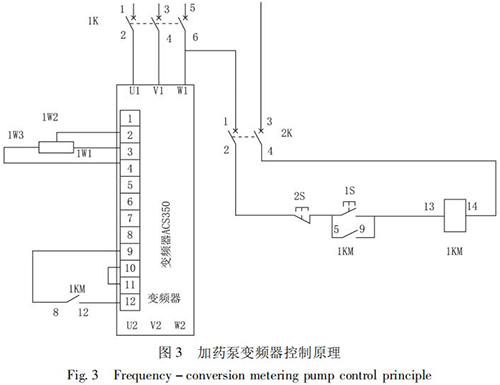 STD - Ⅲ型浮選工藝參數自動測控系統通過雙膜盒差壓計測量原礦漿濃度; 采用工業水流量計測量原礦漿流量,由 PLC 計算出入浮干煤泥量和藥劑的瞬時添加量,用變頻式計量泵完成浮選藥劑的添加。通過上位機還可以打印小時、班、天及月的運行數據,更加有利于生產管理及技術分析,藥劑自動原理如圖 2 所示,k1、k2、k3 是計算修正參數。以 PID 算法為核心,通過優化控制程序計算出藥劑給定量,在捕收劑和起泡劑管道上分別安裝藥劑測量裝置,用于檢測藥劑的添加量。當藥劑測量值小于藥劑給定量時,PID 輸出增大,反之則減小。加藥泵變頻器控制原理如圖 3 所示。
